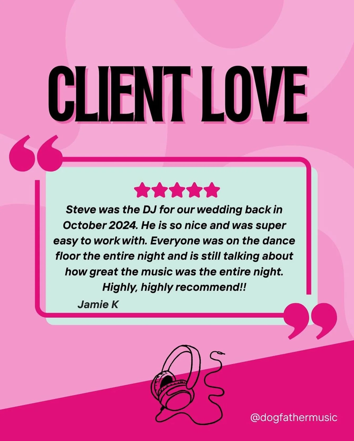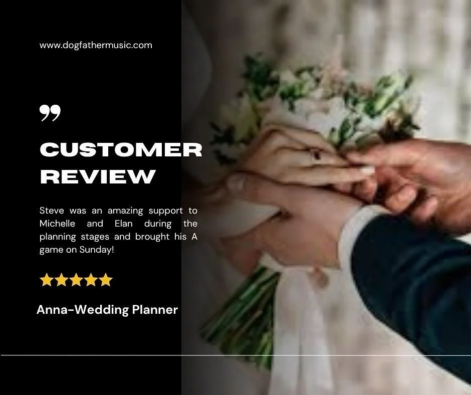 As a wedding officiant I have seen my fair share of average, mediocre, or just plain bad DJs. Not so with Steve and Dogfather Music! He is an absolute professional and made my job easy. It’s great to work with someone who knows what he’s doing and takes the time to explain things.